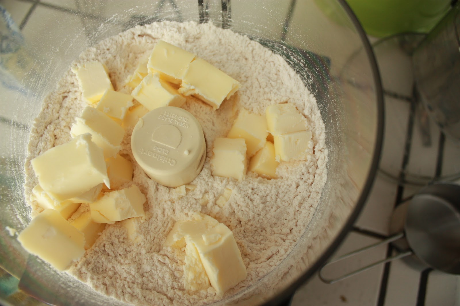 Add the dry ingredients to the bowl of a food processor, pulse to combine. Add the chilled butter and pulse on and off until the butter is the size of peas. Add the cold water with the machine running, then pulse on and off until the dough start to come together. Small pieces of butter should still be visible. Empty the dough on a floured surface and bring it together, do not over mix it. Wrap in plastic wrap and chill for 2 hours. Roll the dough to a 1/8 thickness, line a tart shell and freeze for 20-30 minutes.